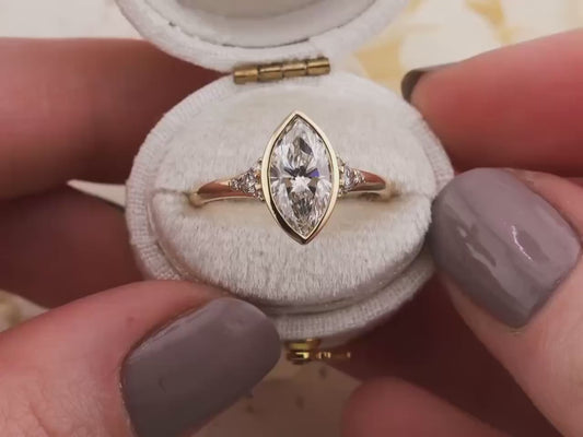 Marquise cut engagement ring lab diamond bezel set ring 14k solid gold engagement ring with side stones and tapered band IGI certified