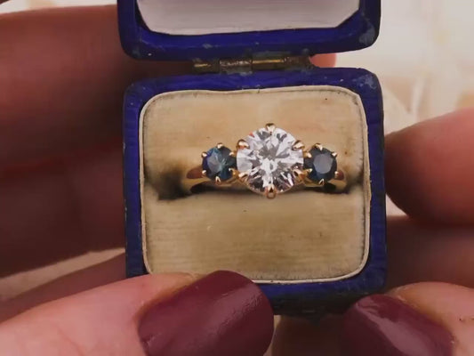 Round cut three stone engagement ring with sapphire side stones lab grown diamond 2 carat 14k solid gold IGI certified lab grown diamond