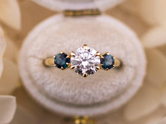 1.70ct Round cut three stone engagement ring with sapphire side stones