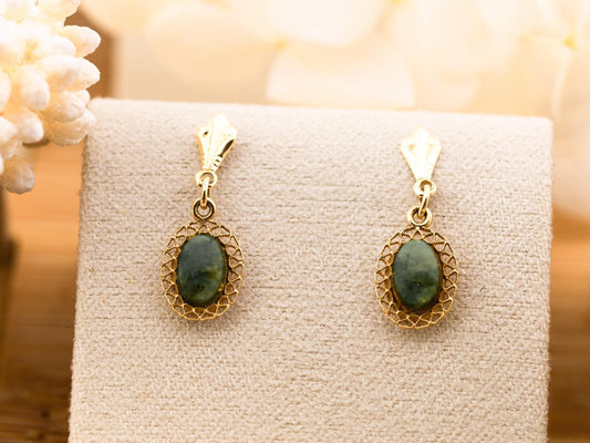 Vintage green agate earrings 14k solid yellow gold drop earrings filigree