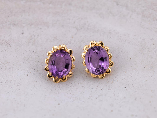 Vintage Amethyst earrings stud earrings floral design solid gold 14k gold stud antique earrings oval amethyst