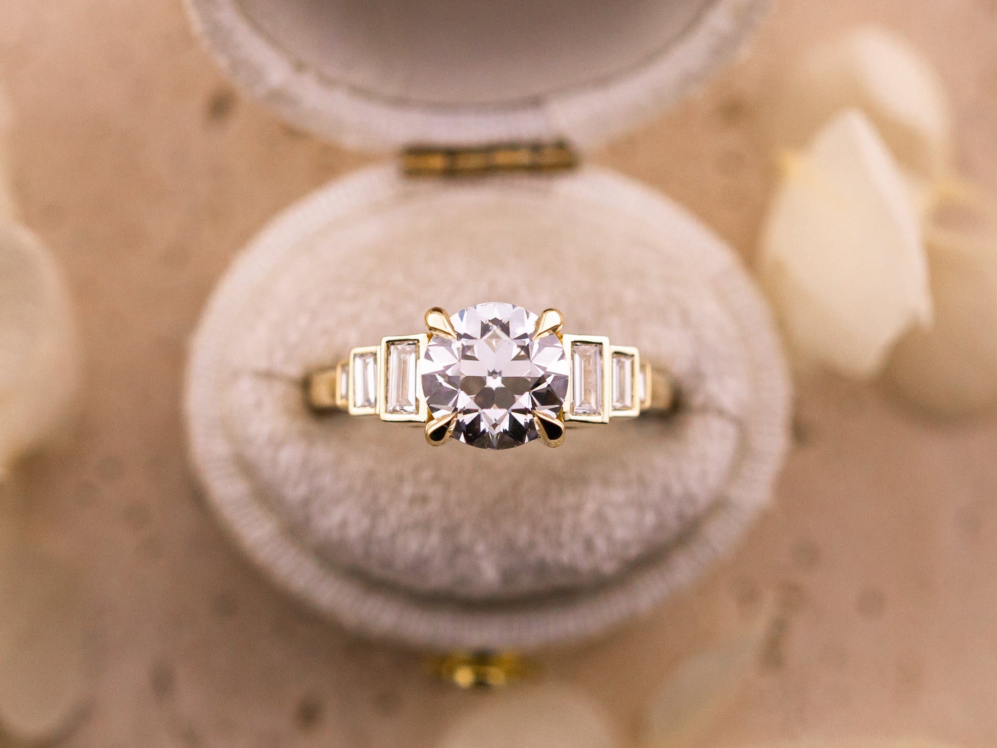 An art deco–inspired design centered around a luminous 2.05ct E VS1 old European cut lab-grown diamond, IGI certified. The center stone is framed by sleek, bezel-set baguette side stones, all set in 14k yellow gold. With its balanced geometry and soft, vintage sparkle, this ring feels both architectural and romantic — a nod to a bygone era with an effortless, modern sensibility.