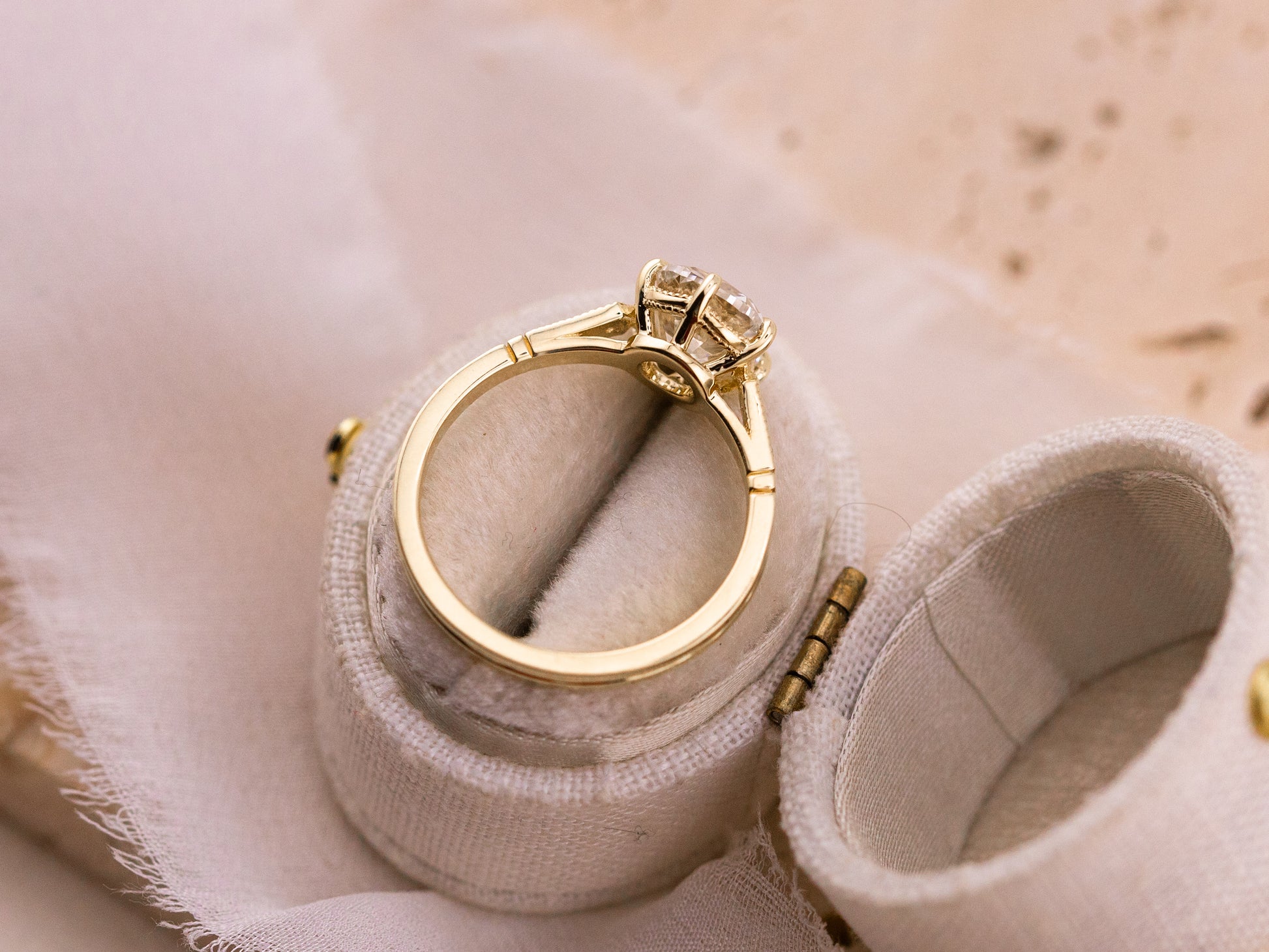Crafted in 14k yellow gold, the setting features delicate side stone accents wrapped in milgrain and a scalloped basket finished with matching milgrain detail. It feels vintage without feeling heavy, refined yet still easy to wear every day.