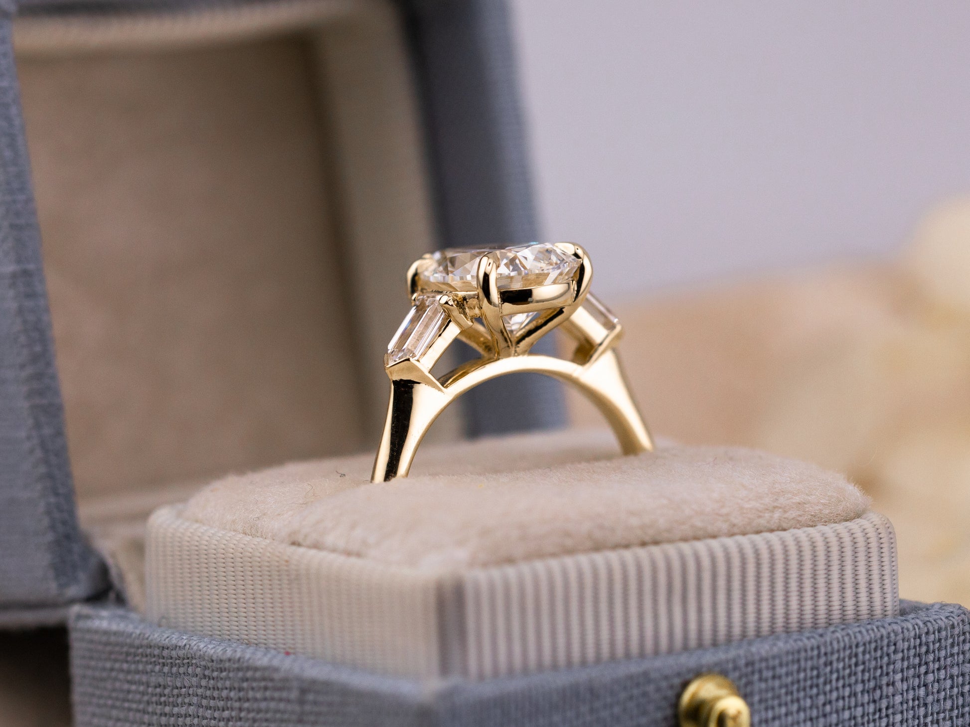 A three-stone design centered with a 3.00ct lab-grown pear-shaped diamond (F color, VVS2 clarity, LG669467097), flanked by sleek bullet-cut side stones for a sharp, balanced silhouette. The contrast between the soft curves of the pear and the clean lines of the bullets gives this ring a modern, architectural feel.