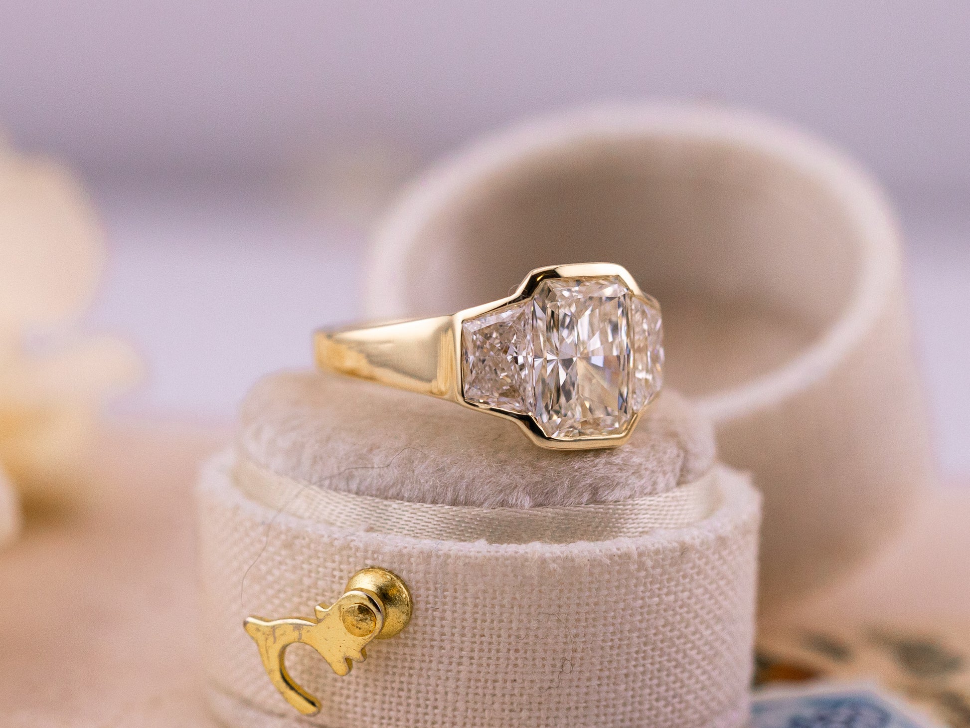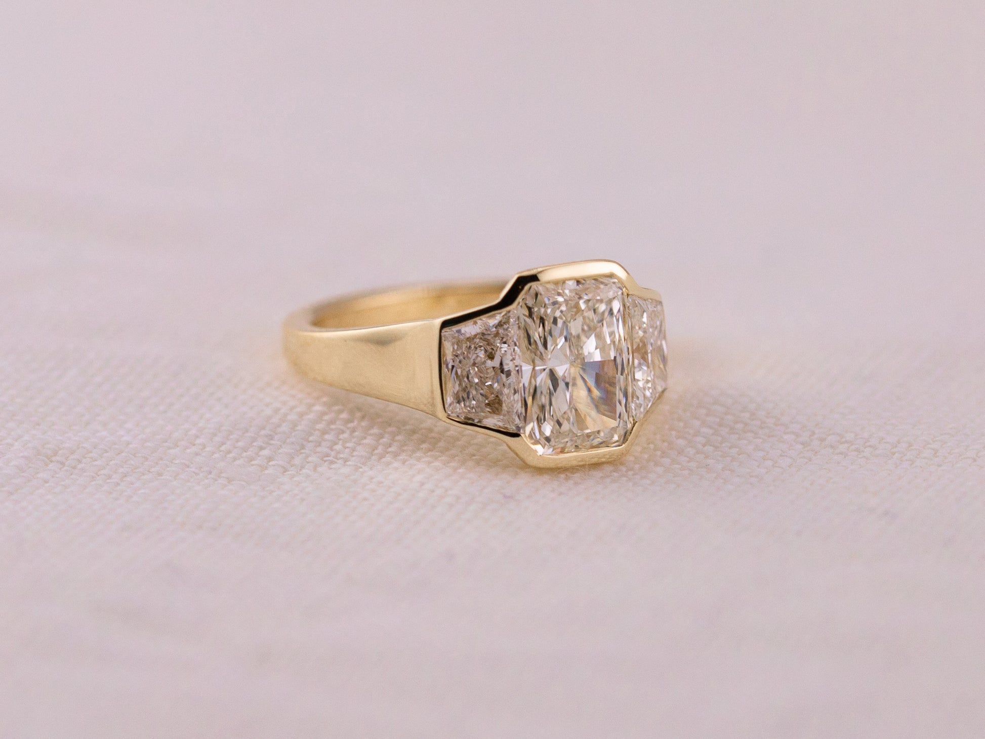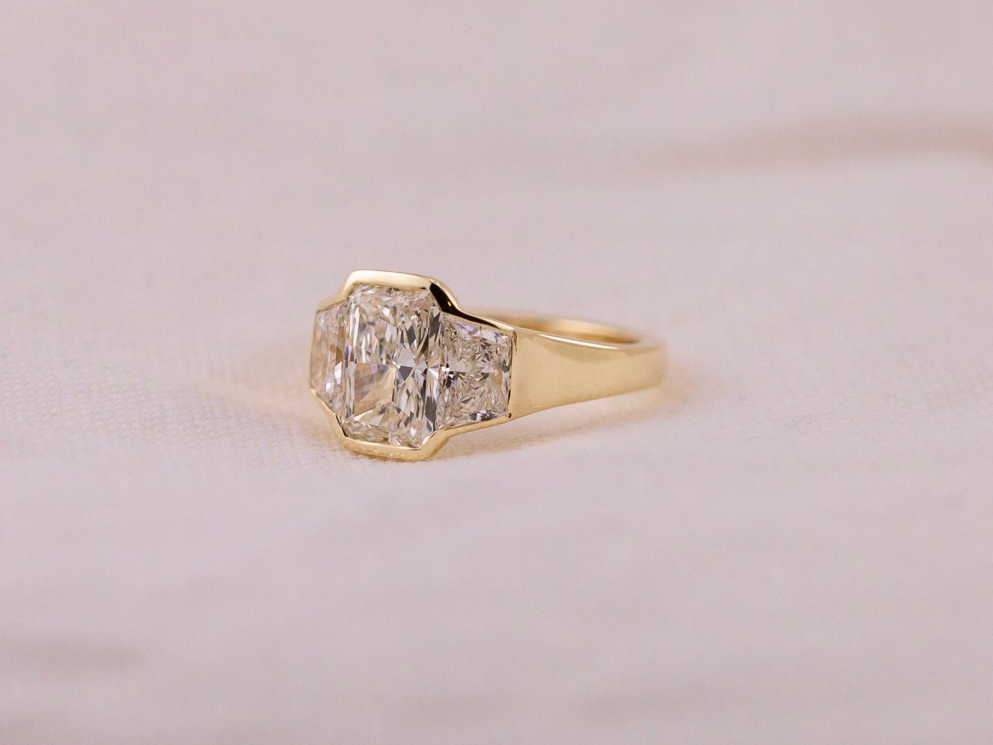 A bold, modern three-stone design centered with a 1.97ct lab-grown radiant cut diamond (G color, VVS2 clarity, IGI LG727568842). The center stone is fully surrounded by a sleek bezel and flanked by trapezoid brilliant cut side stones (0.50ct each), creating strong lines and striking balance.