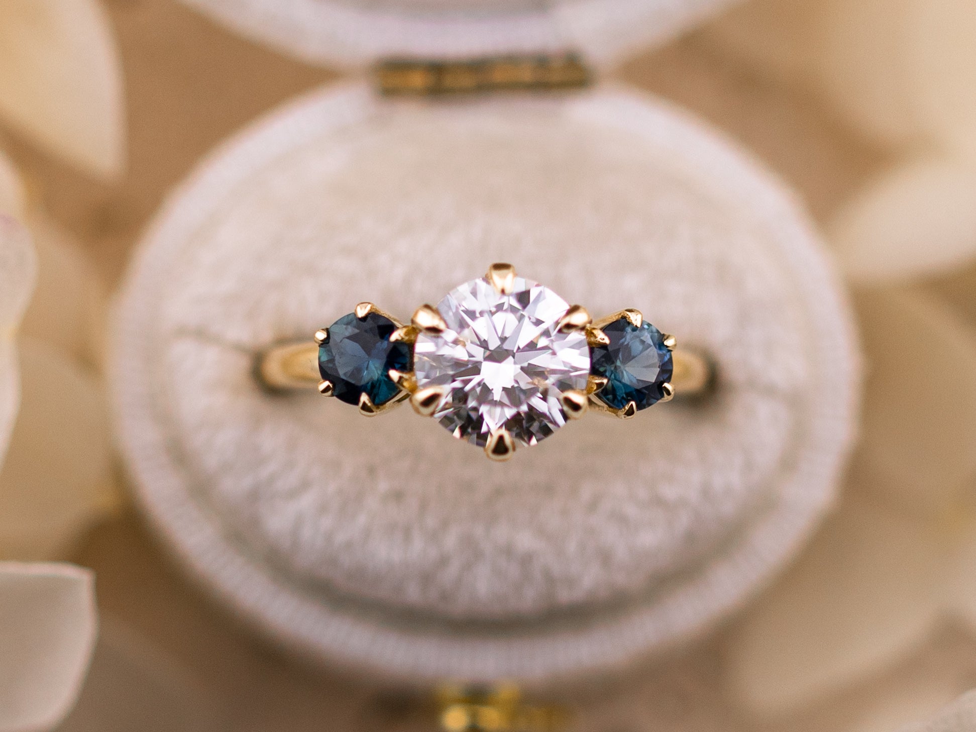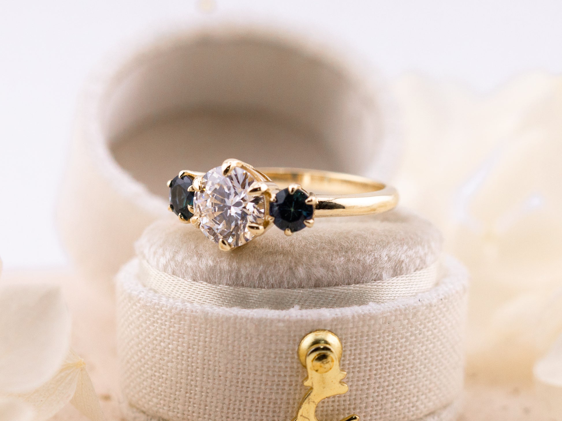 Set in 14k solid yellow gold, this piece feels both elegant and distinctive — a refined take on a traditional three-stone design with thoughtful, unexpected details.