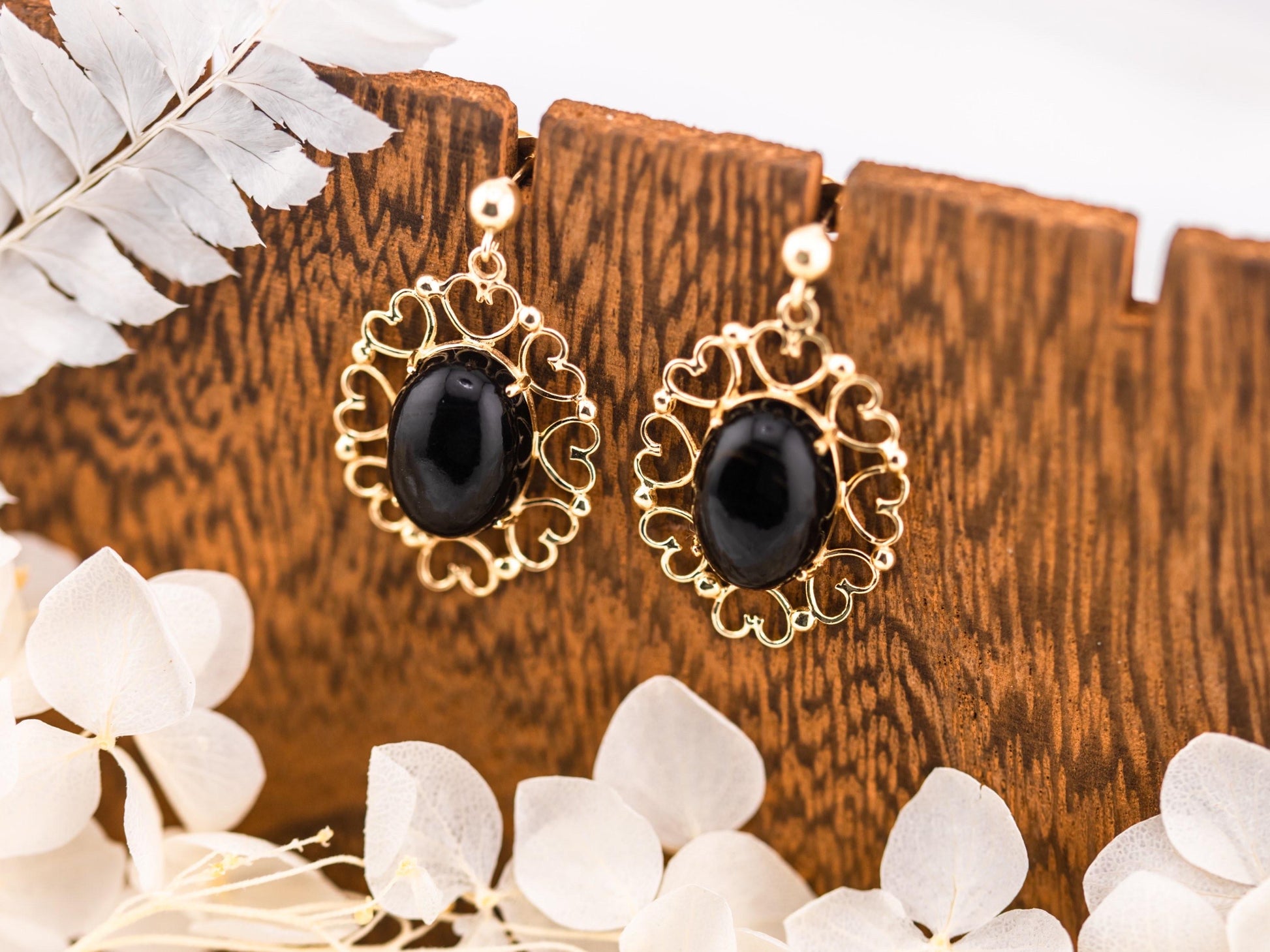 Vintage Onyx Earrings Post Dangle Earrings 14k Solid Gold